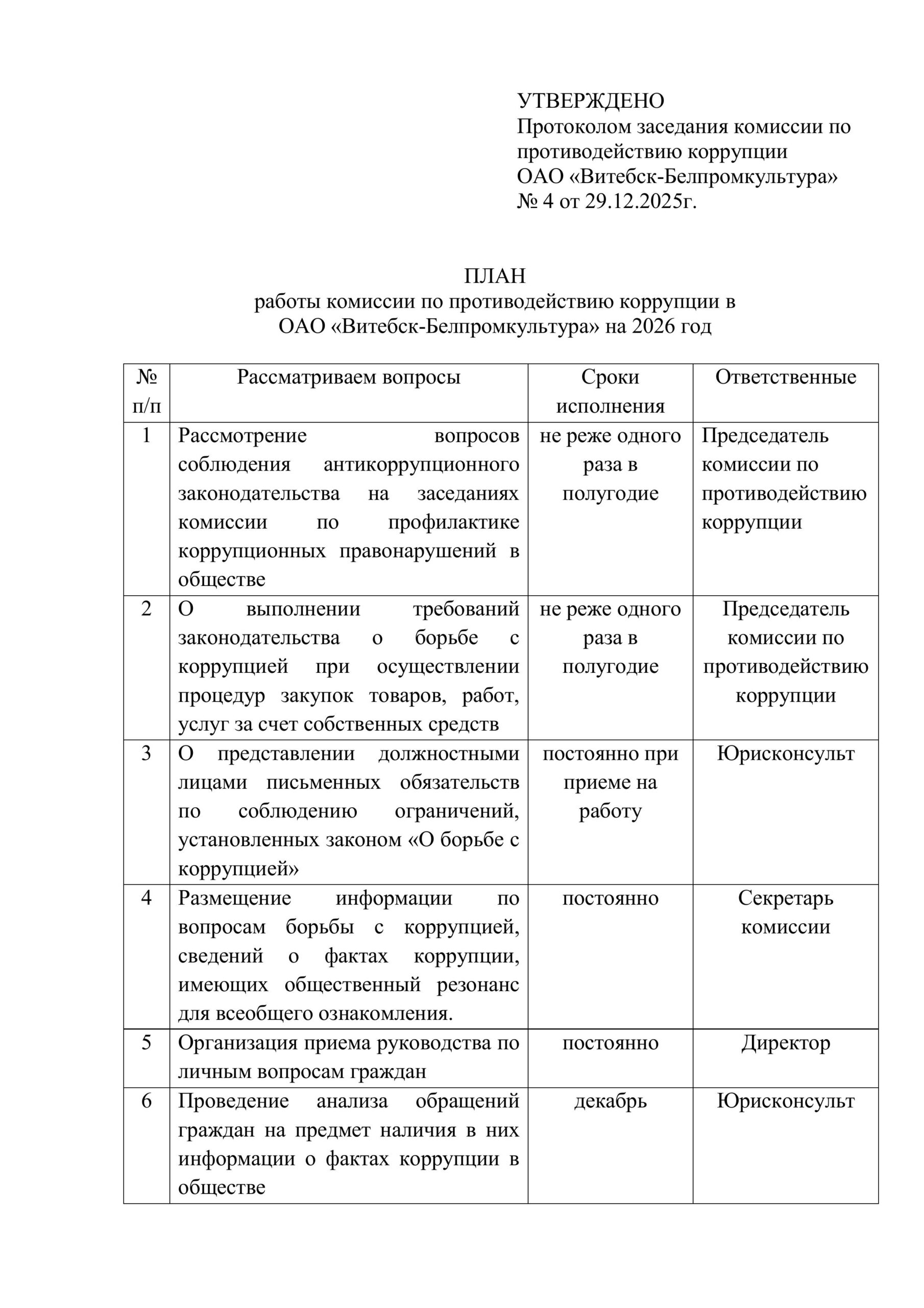 Новости План работы комиссии по противодействию коррупции в ОАО «Витебск-Белпромкультура» на 2026 год 29 января, 2026 Опубликовано Администратор 25 Окт